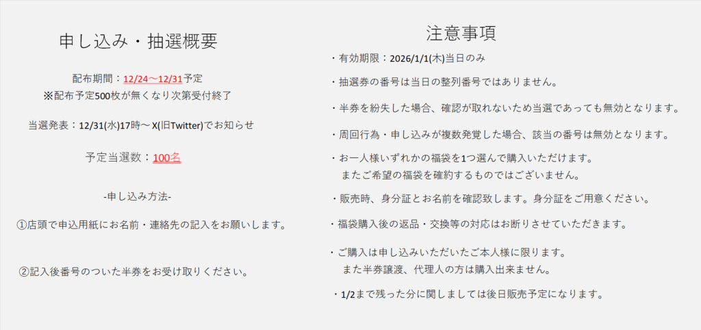 2025年12月24日 お知らせもくじ Toggle購入券抽選会 詳細・注意書きポケモンカード福袋 お品書きはコチラ⇩購入券抽選会 詳細・注意書き12/24(水)より、R8.1月1日(木)販売のポケカ福袋の抽選券を店頭にてお配り致します!先着500枚、当選数100名様となります。下記注意事項を必ずお読みください。 ※当選券は1/1当日のみ有効になります。 ポケモンカード福袋 お品書きはコチラ⇩🎍2026年1/1(木)販売開始 ポケモンカード福袋お品書き🎍 Post Views: 2,016