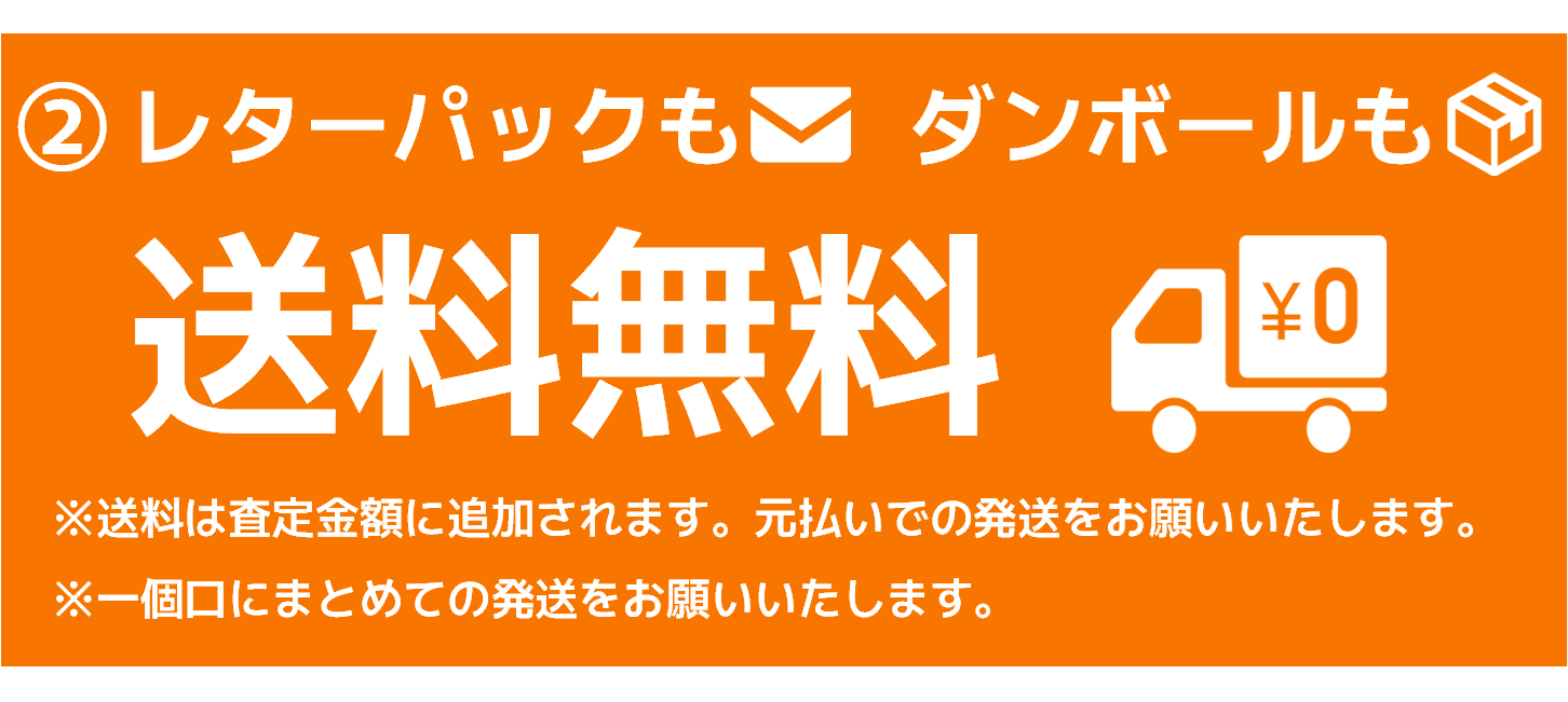 | 送料 | レターパック、ダンボール共に送料無料(送料を査定に追加) (ダンボールの場合、元払いでの発送をお願いします。) |
