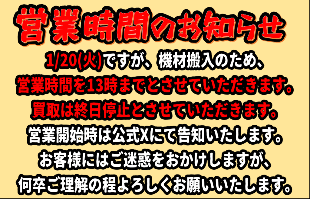 2026年1月13日 お知らせ R8.1/20(火)の営業時間ですが、機材搬入の為営業時間を13時までとさせて頂きます。 また、買取については終日停止となります。 営業開始時には当店の公式Xにてお知らせいたします。 ご迷惑をお掛け致しますが、何卒宜しくお願い致します。 Post Views: 32