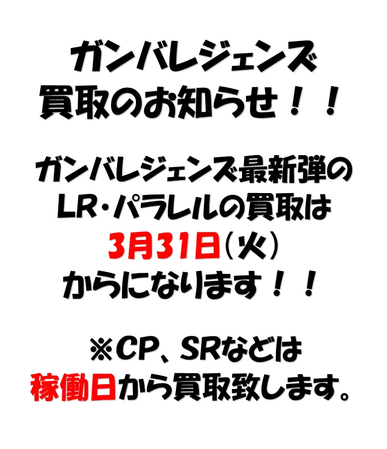 2026年3月27日 カード最新弾 バーサスロード稼働開始案内 Toggle最新弾 バーサスロード稼働開始3連続カード無料配布キャンペーン!買取は3月31日(火)からいよいよ本日3/27(金)からガンバレジェンズ最新弾 バーサスロード(VR弾)が稼働開始です!3連続カード無料配布キャンペーン!店頭ではカードの無料配布キャンペーンも始まります!!キャンペーン第1弾は『仮面ライダードォーン』!カードを貰いに来るだけでもOKです!是非お気軽におたちゅう。秋葉原3号店までお越しください!!買取は3月31日(火)から最新バーサスロード1弾のLR・パラレルの買取は3月31日(火)からとなります。